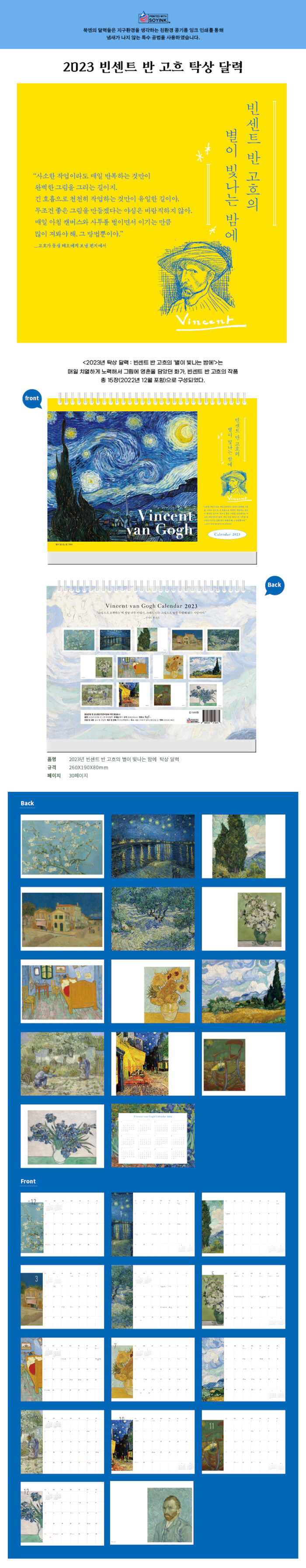 『2023년 빈센트 반 고흐의 별이 빛나는 밤에 탁상달력』은 매일 치열하게 노력해서 그림에 영혼을 담았던 화가, 빈센트 반 고흐의 작품 총 13장(2022년 12월 포함)으로 구성되었다. 고흐는 타고난 천재처럼 여겨지지만, 사실 하루도 습작을 멈추지 않았던 노력파였다. 거기에 이해받으려 할수록 오해를 받는 일상에서, 그림으로 말을 건네려고 지독하게 애썼다. 이 달력은 특별히 고흐의 진심이 강렬하고 또렷하게 들리는 후기 작품들로 꾸며졌다.