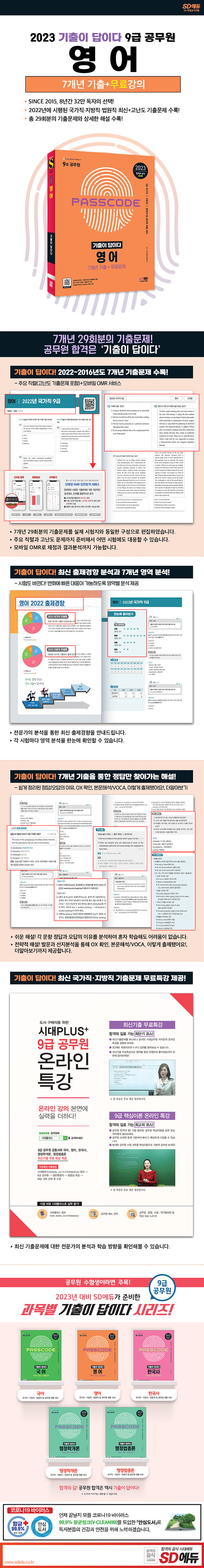 합격을 당겨주는 기출의 힘을 믿으세요!세상에 완벽하게 새로운 문제는 없습니다. 엄정한 평가기준을 요구하는 공무원 시험에서도 자주 출제되는 영역과 유형은 반드시 존재합니다. 따라서 공무원 시험은 기출문제를 기반으로 학습하는 것이 가장 효율적입니다. 공무원 시험 출제진들이 수험생들에게 남긴 유일한 합격의 단서! ‘기출문제’ 정복으로 공무원의 꿈을 이루시기 바랍니다! 지난 8년간 그래왔듯이, 2023년에도 공무원 시험은 SD에듀의 ‘기출이 답이다’가 수험생 여러분의 답이 되어줄 것입니다. 수험생 모두에게 합격의 기쁨이 있기를 진심으로 기원합니다.