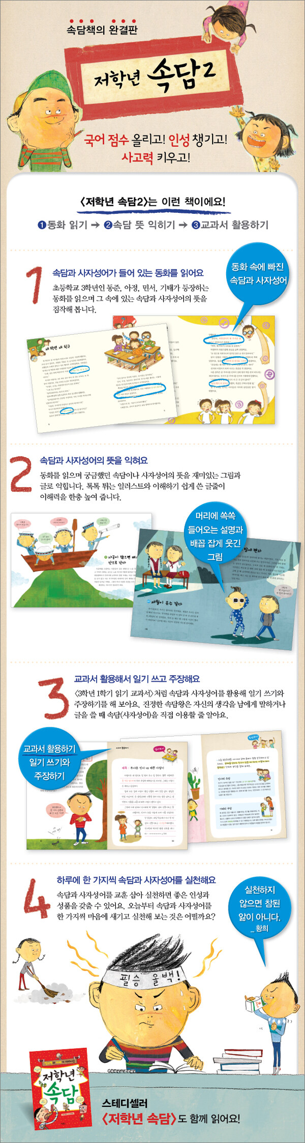 한 줄에 담긴 인성 교과서 <저학년 속담2><저학년 속담2>는 생활 속에서 직접 쓸 수 있는 속담과 사자성어를 저학년 눈높이에 맞게 더 쉽고 재미있게 배울 수 있도록 구성한 책입니다. 속담과 사자성어가 들어간 동화를 읽고 난 뒤, 명쾌한 뜻풀이를 보고 일기 쓰기와 주장하기를 통해 한 번 더 다져주면 어디에서나 ‘속담’과 ‘사자성어’를 만나도 자신만만 의기양양할 수 있어요. 속담 책의 완결판 <저학년 속담2>를 읽고 저학년들의 필수인 속담과 사자성어를 꽉 잡으세요.