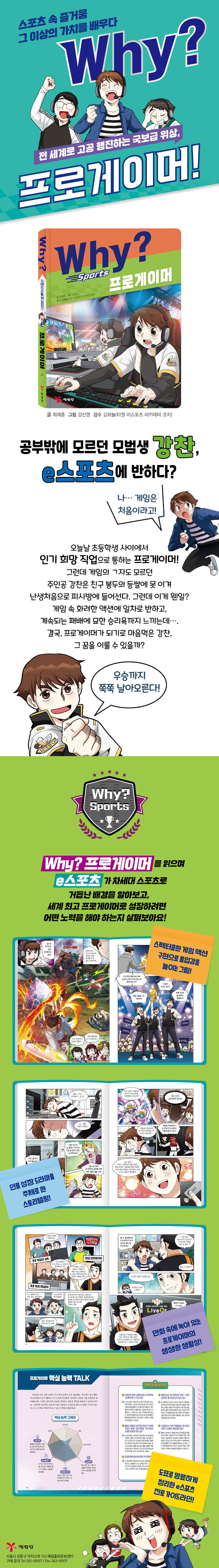Why? 스포츠의 시작, 프로게이머!어린이들의 꾸준한 사랑을 받아 온 Why? 시리즈가 이번에는 ‘스포츠’로 찾아왔다. 어린이에게 스포츠 속 즐거움과 더불어 도전경쟁용기결속배려 등의 건강한 삶의 가치를 들려주는 본격 ‘스포츠 학습만화’이다.