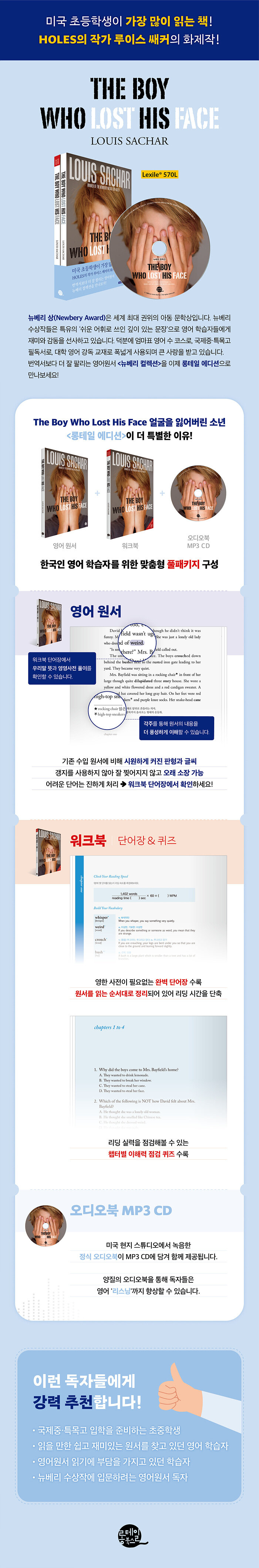 이 책은 루이스 쌔커의 화제작 『The Boy Who Lost His Face(얼굴을 잃어버린 소년)』를 영어 학습 목적에 맞게 재탄생시킨 ‘맞춤형 원서’입니다.