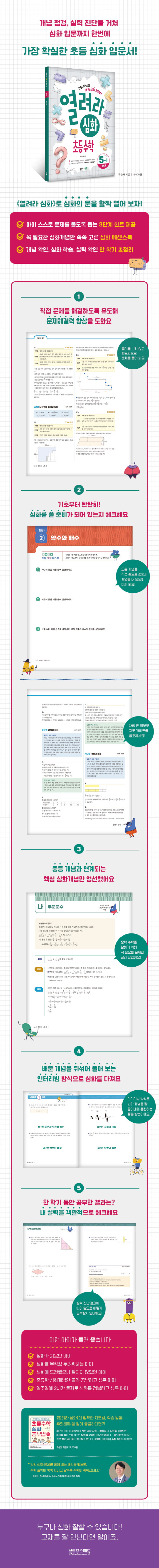 심화를 하는 데 꼭 많은 문제가 필요하지 않습니다. 심화 능력을 기르는 데 도움이 되고 중등 과정과 연계가 깊은 중요한 문제들만 골라 학습량과 난이도를 조절했습니다. 심화의 가장 걸림돌이 바로 학습량의 부담이기 때문입니다. 기존 심화 문제집의 방대한 분량 대신 단원별 핵심 문제만 담아 아이와 학부모 모두 시간과 양에 쫓기지 않도록, 일주일에 2시간씩이면 한 학기 분량을 끝낼 수 있도록 구성했습니다. 적은 문제를 풀더라도 충분한 시간을 두고 제대로 풀어야 수학적 사고력과 문제해결력을 키울 수 있습니다. 이것이 심화의 궁극적인 목표입니다. 또한, 기존 문제집에서는 볼 수 없었던 단계별 힌트 방식의 답지를 제공합니다. 최대 3단계로 구성한 단계별 힌트는 아이에게 어떻게 힌트를 주어야 할지 막막한 학부모에게는 좋은 가이드가 되고, 답지 풀이에 의존하는 아이에게는 단계별로 생각하도록 하면서 문제를 더 깊이 이해하게 합니다. 학부모와 아이가 모두 즐겁게 심화 수학을 할 수 있도록 세심하게 만든 문제집입니다. 《열려라 심화 초등수학》으로 심화에 한 발짝 더 다가가 보길 바랍니다.