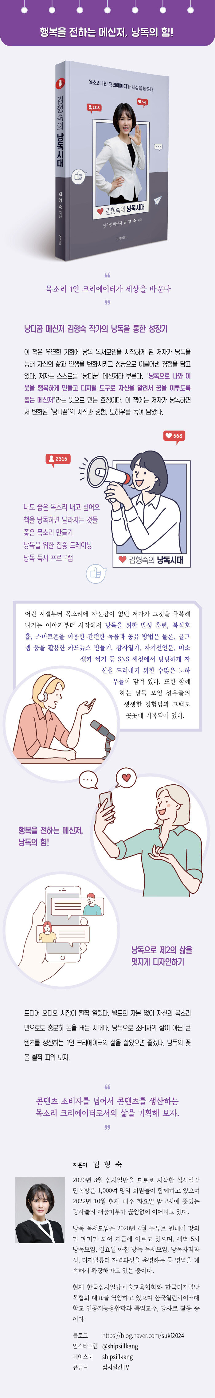 낭디꿈 메신저 김형숙 작가의 낭독을 통한 성장기이 책에는 어린 시절부터 목소리에 자신감이 없던 저자가 그것을 극복해나가는 이야기부터 시작해서 낭독을 위한 발성 훈련, 복식호흡, 스마트폰을 이용한 간편한 녹음과 공유 방법은 물론, 글그램 등을 활용한 카드뉴스 만들기, 감사일기, 자기선언문, 미소셀카 찍기 등 SNS 세상에서 당당하게 자신을 드러내기 위한 수많은 노하우들이 담겨 있다. 또한 함께하는 낭독 모임 성우들의 생생한 경험담과 고백도 곳곳에 기록되어 있다.