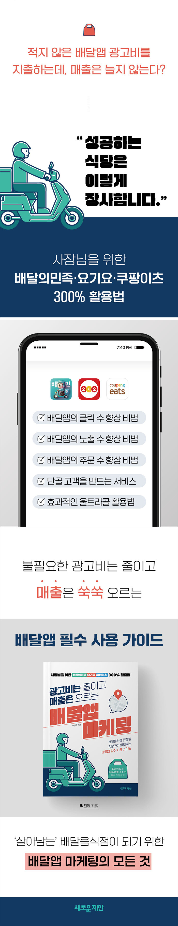 배달음식점 컨설팅 전문가인 저자가 실제 경험한 수많은 사례를 통해 체득한 ‘살아남는’ 배달음식점이 되기 위한 배달앱 마케팅 비법을 공개한다. 배달음식점을 운영 중인 사장님과 예비 창업자에게 좋은 길잡이가 돼줄 것이다.