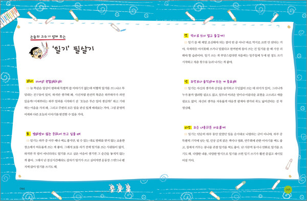 3. 실전 대비를 위한 다양한 문제들과 과제들을 소개합니다!말로만 가르쳐서는 어린이들의 논술 실력이 절대 늘지 않습니다. 이 책은 여러 가지 실제적인 과제들을 어린이들에게 내놓습니다. 최고수의 일기 쓰기, 메모하기, 체험 학습 계획표 짜기 등을 본보기 자료로 담았으며, 엄마나 친구들과 함께 풀어보면 좋을 재미난 문제들을 많이 실었습니다. 이를 통해 어린이들은 논술에 한 걸음 더 나아갈 수 있고, 호기심과 사고력을 기를 수 있는 좋은 기회를 만나게 될 것입니다.