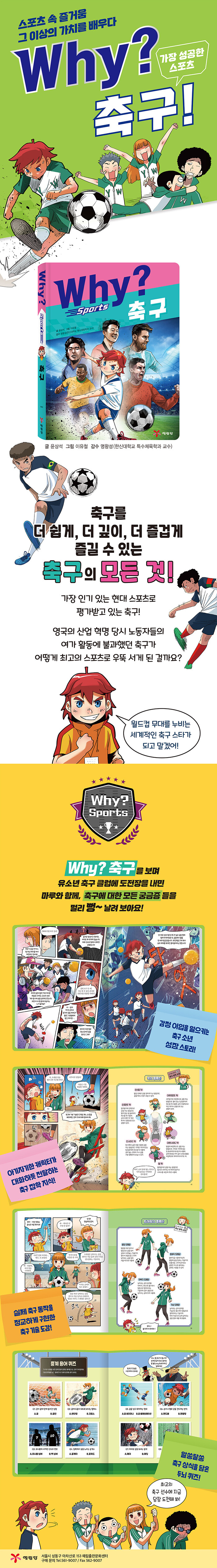 〈Why? 스포츠 축구〉는 유럽 무대 진출을 꿈꾸는 한 축구 유망주의 성장 일기를 통해 축구 선수가 되기 위한 기본 자세와 핵심 능력, 유소년 클럽에서의 생활들을 생생하게 그려 냈다. 또한 축구의 역사와 규칙, 중계 용어들에 숨겨진 비하인드 스토리들을 아기자기한 캐릭터와 디테일한 일러스트, 알쏭달쏭 퀴즈들을 통해 흥미롭게 배울 수 있도록 구성했다.