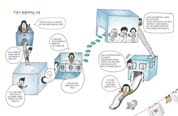 또 화학섬유가 생산되고, 소비되며, 폐기되는 과정에서 일어나는 환경오염과 노동착취, 불공정한 거래로 고통 받는 사람들의 이야기 등등 옷에 얽힌 환경 문제를 두루두루 다루며, 유기농 면과 공정한 방식으로 생산된 제품을 사는 현명한 소비가 이루어져야 함을 쉽고 친절하게 설명하고 있다.