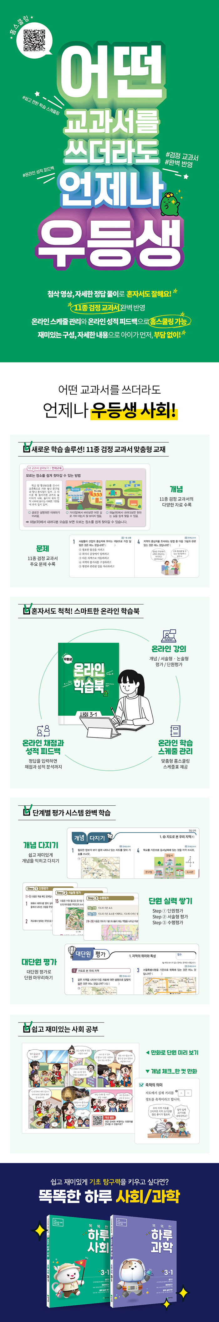 11종 검정 사회 교과서를 완벽 분석하여 한 권에 담아낸 교재이므로 어떤 교과서로 공부하더라도 [우등생 사회] 한 권이면 충분하다. 온라인 강의와 스케줄표로 쉽고 스마트하게 공부할 수 있는 홈스쿨링 학습서로, 동영상 강의, 온라인 학습 스케줄 관리로 온-오프 연계 학습을 강화하였다. 또한 [단원평가] 결과 분석을 통해 개인별 평가 자료를 제공하며, 이를 통해 학생의 개인 성적을 관리할 수 있다.