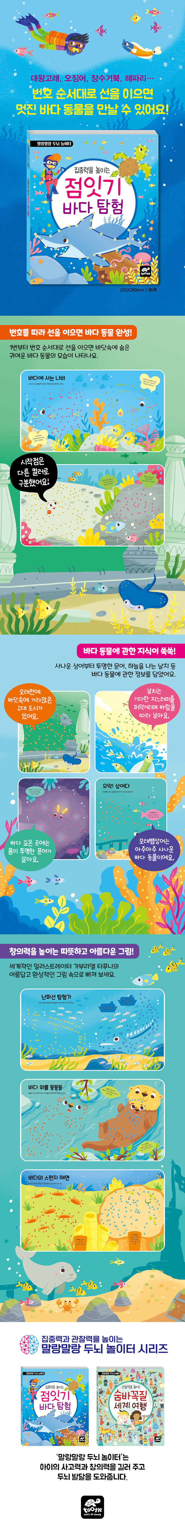 바다에 사는 약 80마리의 바다 동물과 난파선, 잠수함, 고대 유물 등 환상적인 바닷속을 경험할 수 있도록 구성한 점잇기 놀이북이다. 번호 순서대로 선을 이으면 대왕고래부터 상어, 문어, 거북이까지 사납고 무서운 갖가지 바다 동물을 만날 수 있다. 또 바다 동물마다 생김새나 특징 등의 간단한 정보를 담아 더욱 재미있게 놀이 활동에 참여할 수 있다.
