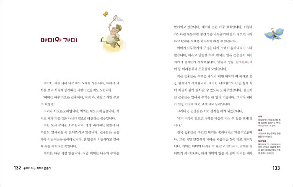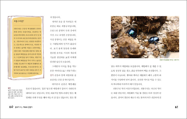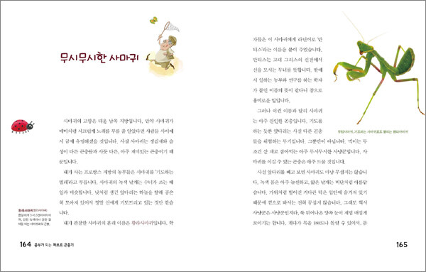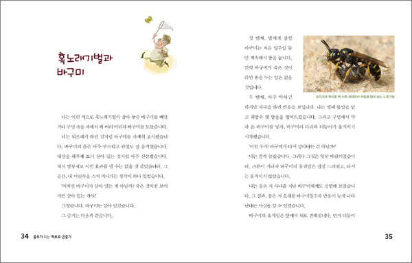 2. 자연에 대한 호기심을 자극합니다.애벌레에게 신선한 먹이를 주기 위해 벌레를 죽이지 않고 마취시켜 보관하는 ‘혹노래기벌’, 집에 구멍이 생기면 바로 막아 수분이 날아가는 것을 방지하는 뛰어난 집수리공 ‘쇠똥구리’, 대포 소리도 듣지 못할 정도로 귀가 어둡지만 열심히 노래하는 숲 속의 가수 ‘매미’, 짝짓기가 끝난 후 영양을 섭취하기 위해 수컷 사마귀를 잡아먹는 ‘암컷 사마귀’ 등 이 책에는 이름만으로도 우리 아이들의 호기심을 불러일으키는 곤충에 대한 흥미진진한 이야기가 실려 있습니다.