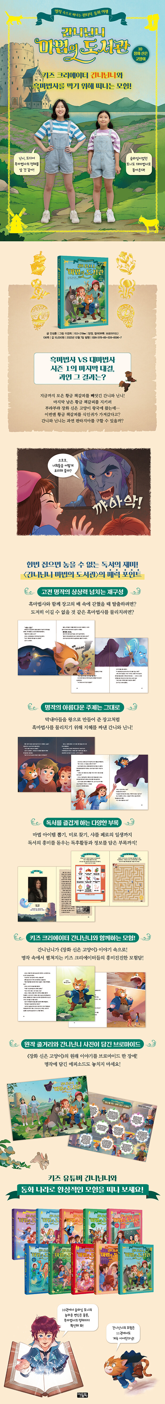 마법이 살아 숨 쉬는 동화 왕국 판타지아로 신나는 모험을 떠나다!요즘 아이들의 친근하고 편안한 일상을 보여 주며 많은 사랑을 받는 유튜브 채널 ‘간니닌니 패밀리’. 간니와 닌니가 이번엔 동화의 주인공이 되었어요! 피터 팬, 앨리스, 알라딘, 도로시, 앤, 인어 공주까지 이름만 들어도 아는 명작 주인공들과 친구가 되어 동화 나라를 여행하지요. 책보다 슬라임이나 유튜브와 더 친숙한 어린이 친구들에게 《간니닌니 마법의 도서관》시리즈는 책 읽기가 얼마나 즐겁고 신나는지 알려 준답니다. 열 번째 이야기인 ‘장화 신은 고양이’에서 간니와 닌니는 지금까지 모은 황금 책갈피를 흑마법사에게 모두 빼앗겨요. 그리고 마지막 남은 황금 책갈피만이라도 먼저 손에 넣기 위해 꾀 많은 고양이, 장고에게 도움을 청하지요. 지혜를 모은 자매와 고양이는 과연 흑마법사보다도 먼저 황금 책갈피를 손에 넣을 수 있을까요? 시리즈를 거듭할수록 흥미진진해지는《간니닌니 마법의 도서관》! 환상적인 모험이 여러분을 찾아갑니다.