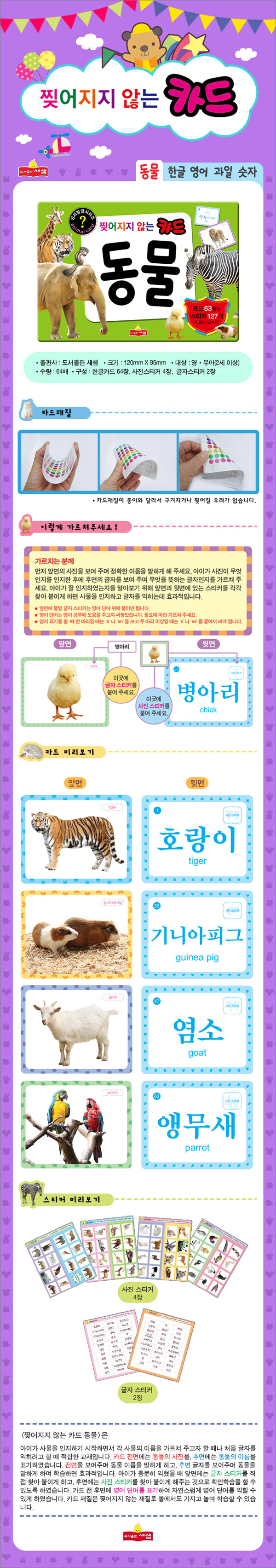 <찢어지지 않는 카드 동물>은아이가 사물을 인지하기 시작하면서 각 사물의 이름을 가르쳐 주고자 할 때나 처 음 글자를 익히려고 할 때 적합한 교재입니다. 카드 전면에는 동물의 사진을, 후면 에는 동물의 이름을 표기하였습니다. 전면을 보여주며 동물 이름을 말하게 하고, 후면 글자를 보여주며 동물을 말하게 하며 학습하면 효과적입니다. 아이가 충분히 익혔을 때 앞면에는 글자 스티커를 직접 찾아 붙이게 하고, 후면에는 사진 스티커를 찾아 붙이게 해주는 것으로 확인학습을 할 수 있도록 하였습니다. 카드 전 후면 에 영어 단어를 표기하여 자연스럽게 영어 단어를 익힐 수 있게 하였습니다. 카드 재질은 찢어지지 않는 재질로 물에서도 가지고 놀며 학습할 수 있습니다.