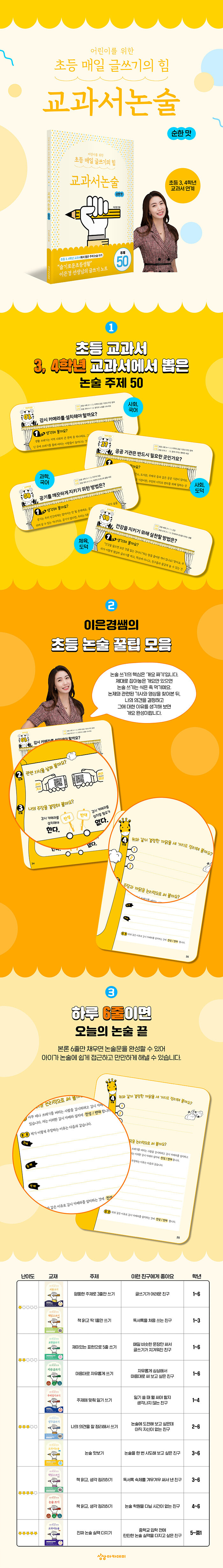 하루 6줄로 시작하는 초등 첫 논술 책이다. 글쓰기를 좋아하는 아이에게는 해볼 만한 도전이 될 것이고, 글쓰기가 마냥 어렵고 지루한 아이에게는 논술이 생각보다 만만하다는 걸 아는 기회가 될 것이다. 그만큼 내용은 쉽고, 설명은 친절하다.