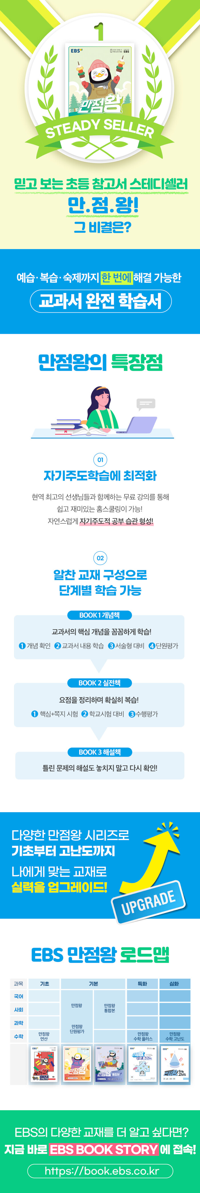 혼자 공부해도 충분한 만점왕!만점왕 한 권으로 학교진도에 따라 공부해 보세요. 개념책에는 학습 개념, 실전책에는 단원별 핵심정리와 확인 문제가 있습니다. 재미있는 무료강의가 있어 만점왕과 함께라면 혼자서도 쉽게 공부할 수 있습니다. 예습·복습·숙제까지 해결되는 교과서 완전 학습서, 초등부터 “EBS 만점왕”과 함께 하세요.