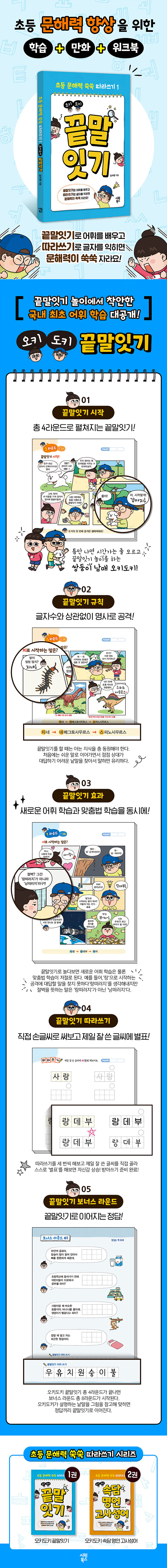 어린이 문해력과 손글씨 발달을 위한 ‘초등 문해력 쑥쑥 따라쓰기’ 시리즈. '끝말잇기' 편은 아이들이 좋아하는 끝말잇기 놀이에서 착안해 국내 최초로 만든 어휘 학습서다. 끝말잇기로 놀다보면 새로운 어휘 학습은 물론 맞춤법 학습이 저절로 된다. 게임에서 등장한 낱말 중에 어린이들이 잘 모를 수도 있는 어휘는 이해를 돕기 위해 설명을 만화 속에 추가했다. 끝말잇기에 나온 주요 단어들을 아이들이 직접 손글씨로 따라 써볼 수 있도록 따라쓰기 칸을 따로 준비했다.
