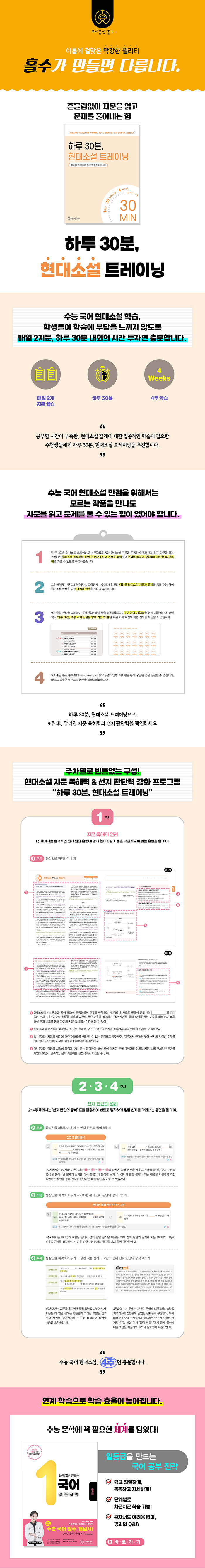 둘째. 매일 2지문씩, 하루에 딱 30분이면 충분!학생들이 학습에 부담을 느끼지 않도록 하루 30분 내외의 시간 투자만으로도 충분하게, 하지만 매일의 학습이 쌓이면 4주 후에는 몰라보게 향상된 현대소설 지문 독해력과 선지 판단력을 확인할 수 있도록! 『하루 30분, 현대소설 트레이닝』은 4주(28일) 동안 매일 현대소설 2지문을 독해하고, 관련 문제를 풀어보면서 올바른 선지 판단 공식을 익혀나갈 수 있도록 구성하였습니다.