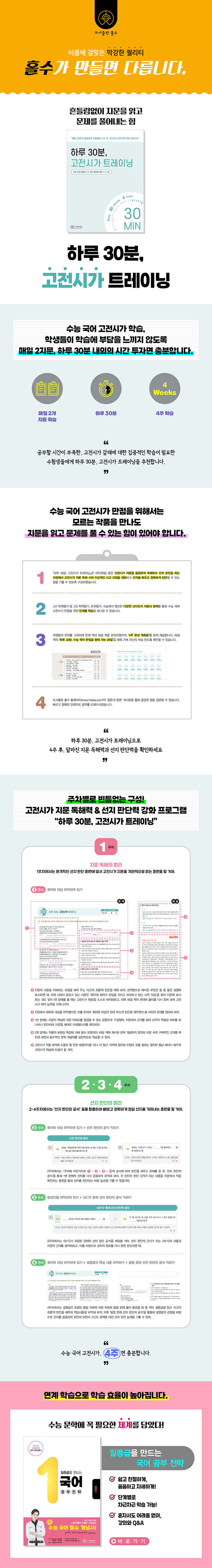 둘째. 매일 1~2지문씩, 하루에 딱 30분이면 충분!학생들이 학습에 부담을 느끼지 않도록 하루 30분 내외의 시간 투자만으로도 충분하게, 하지만 매일의 학습이 쌓이면 4주 후에는 몰라보게 향상된 고전시가 지문 독해력과 선지 판단력을 확인할 수 있도록! 『하루 30분, 고전시가 트레이닝』은 3주(21일) 동안 매일 고전시가 2지문, 1주(7일) 동안 융합 지문 1세트를 독해하고, 관련 문제를 풀어보면서 올바른 선지 판단 공식을 익혀나갈 수 있도록 구성하였습니다.