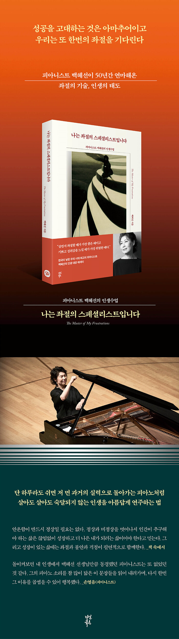 “인생의 열정은 수백 번의 좌절 속에서 피어난다.”좌절 앞에서 주저앉을 것인가, 좌절을 다른 무언가로 승화할 것인가? 그에 대한 해답을 들려줄 수 있는 한 명의 음악가가 여기 있다. 한때 처참한 탈락으로 피아노를 포기하고 전화회사의 영업사원이 되기까지 하였으나 꿈의 무대에 오르기 위하여 다시 건반 앞에 앉은 피아니스트. 동양인 여성이 무대에 오르는 것을 보고 실소하던 관객들에게 감동의 연주를 들려주어 모두 기립하여 박수를 치게 만든, 그리하여 한국 국적으로서는 처음으로 차이콥스키 콩쿠르에서 상위에 입상해 세계에 이름을 알린 연주자. 서울대 음대 사상 최연소의 나이에 교수가 되었지만 더 활발한 연주 활동을 위하여 10년 만에 교수직을 내려놓고 홀로 광야로 떠난 단독자. 아는 사람 하나 없는 미국 땅에서 홀로 갓난아이들을 키우는 생계형 피아니스트였으나 지금은 세계적인 명문 음대 뉴잉글랜드 음악원에서 제자를 가르치며 두 아들딸을 모두 하버드 대학교에 보낸 교육자. 우리 시대 최고의 피아니스트인 백혜선의 이야기이다. 그가 피아노 앞에 앉은 50여 년의 세월 동안 얻은 인생 내공을 이 한 권의 에세이에 담아냈다. 오늘을 열심히 사느라 좌절할 일도 잦은 젊은 독자들에게 이 책은 삶의 지침서가 되어줄 것이다.