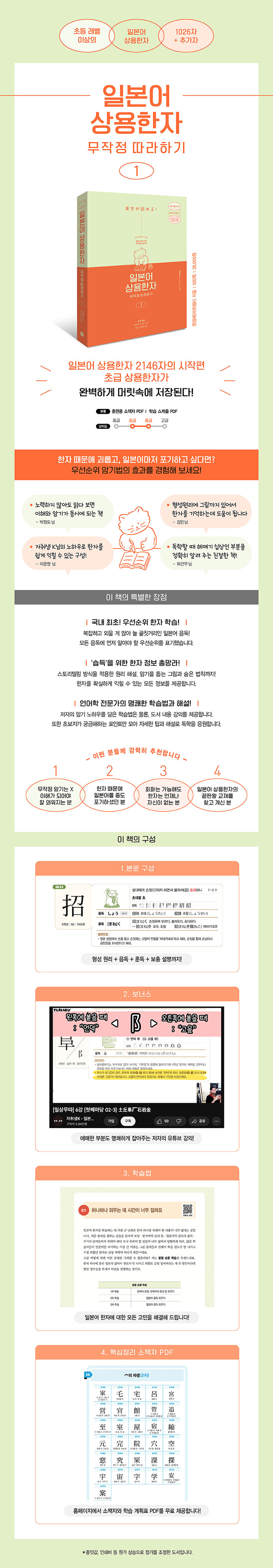 이 책은 일본 초등학교 필수 교육한자 1026자 전체와 기본 부수를 익히기 위한 중학 레벨의 한자 및 부수자 197자를 수록하여, 총 1223자의 한자를 다룬다. 교육한자 레벨, JLPT 급수, 실사용빈도 순위, 원리 해설, 훈음, 총 획수, 획순, 참고 그림, 음독, 훈독, 추가 설명 코너인 ‘잠깐만요’까지! 단순한 정보의 나열이 아닌, 이해와 암기를 돕는 모든 한자 정보를 총망라했다. 특히 원리 해설은 한자의 모양과 의미를 이어주는 스토리텔링 방식을 적용하여, 한자를 쉽게 기억할 수 있도록 만들었다.