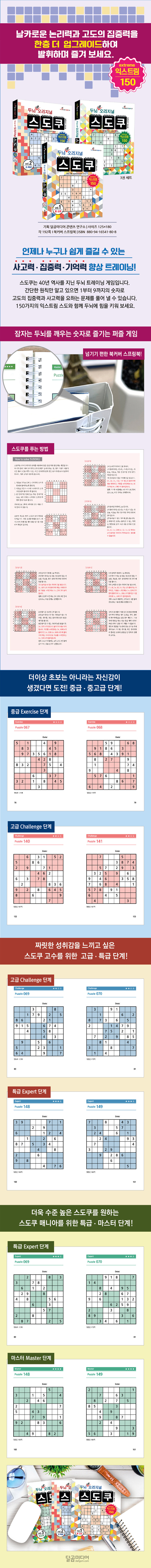 * 사고력‧집중력‧기억력을 높여 줍니다.스도쿠는 영국의 공교육 교재로 이용할 뿐 아니라 우리나라 영재 교육의 필수로 사용될 정도로 논리를 요하는 퍼즐 게임입니다. 이는 규칙에 맞춰 숫자 퍼즐들을 맞춰 나가는 가운데 사고력이 높아지고, 집중력과 기억력도 향상되기 때문입니다.