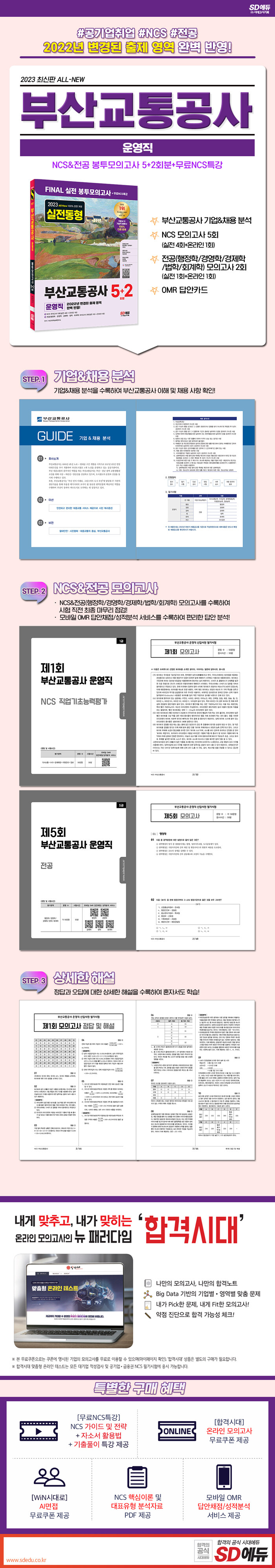 부산교통공사 합격을 위해 SD에듀에서는 채용을 대비하여 부산교통공사 맞춤형 문제로 구성한 『2023 최신판 All-New 부산교통공사 운영직 NCS&전공 봉투모의고사 5+2회분+무료NCS특강』을 출간하였다. 상세한 해설로 혼자서도 학습이 가능하도록 하였으며, 부산교통공사 온라인 모의고사를 무료로 응시할 수 있는 쿠폰을 발급하여 부산교통공사 문제 유형에 대한 연습과 함께 자신의 실력을 최종 점검할 수 있도록 하였다.