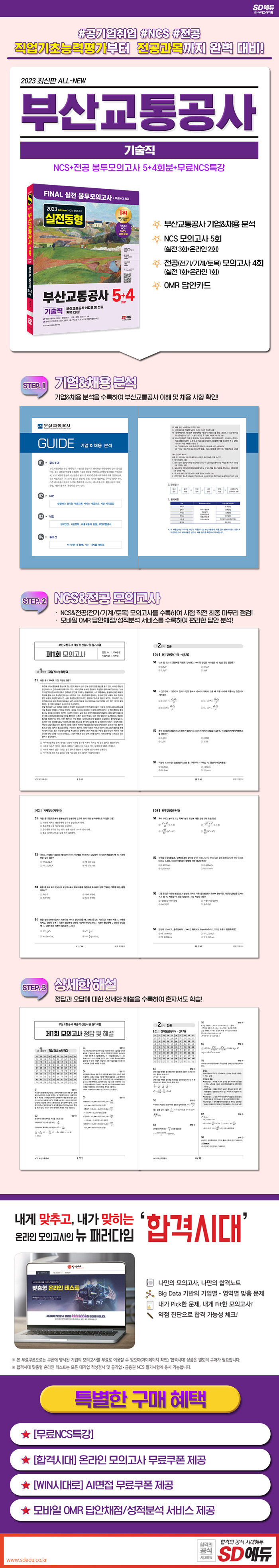 부산교통공사 기술직 필기시험 합격을 위해 SD에듀에서는 2023년 상반기 채용을 대비하여 부산교통공사 기술직 필기시험 맞춤형 문제로 구성한 『2023 최신판 All-New 부산교통공사 기술직 NCS+전공 봉투모의고사 5+4회분+무료NCS특강』을 출간하였다. 상세한 해설로 혼자서도 학습이 가능하도록 하였으며, 온라인 모의고사를 무료로 응시할 수 있는 쿠폰을 제공하여 부산교통공사 문제 유형에 대한 연습과 함께 자신의 실력을 최종 점검할 수 있도록 하였다.