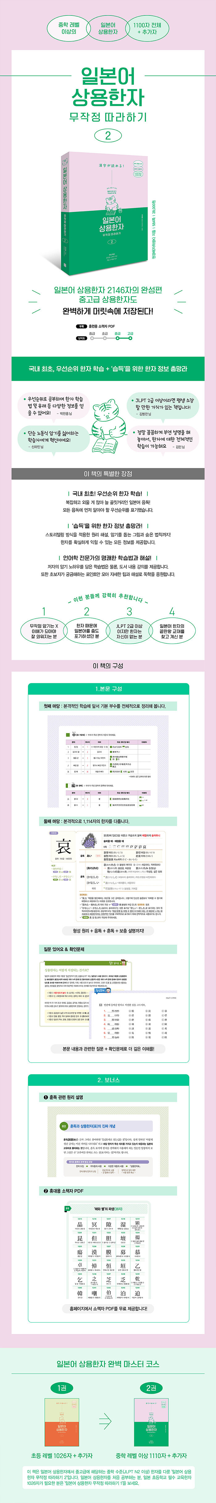일본어 상용한자 2136자의 완성편인『일본어 상용한자 무작정 따라하기 2』는 중학 레벨 이상(JLPT N2)의 상용한자를 완벽하게 마스터할 수 있는 책이다. 일본 중학교 수준의 필수 교육한자 1,110자와 추가자 4자를 수록했다. 암기는 물론 이해를 돕는 한자 정보를 한 권에 총망라했다.