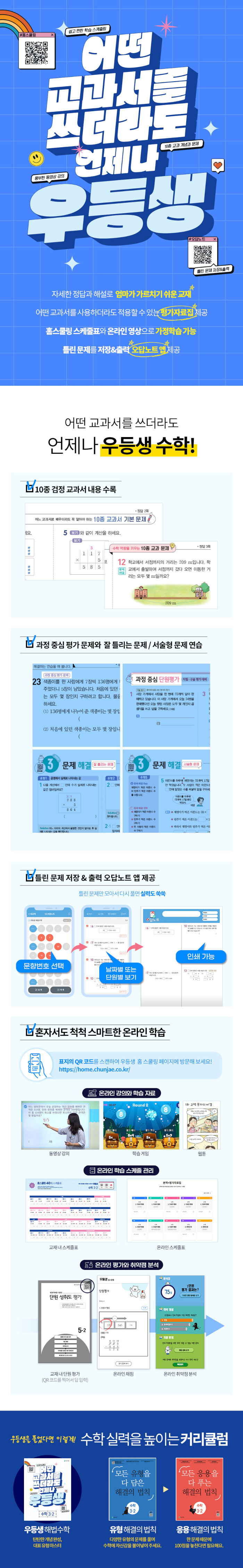 30여년 간의 초등 필수 기본서 교재인 천재교육 우등생 시리즈의 교육 경험과 노하우로 홈스쿨링에 최적합한 교재로 태어났다. 요즘 시대에 딱 맞는 다양한 학습자료들과 풍부한 동영상 강의로 쉽게 풀 수 있는 방법까지 알려준다.