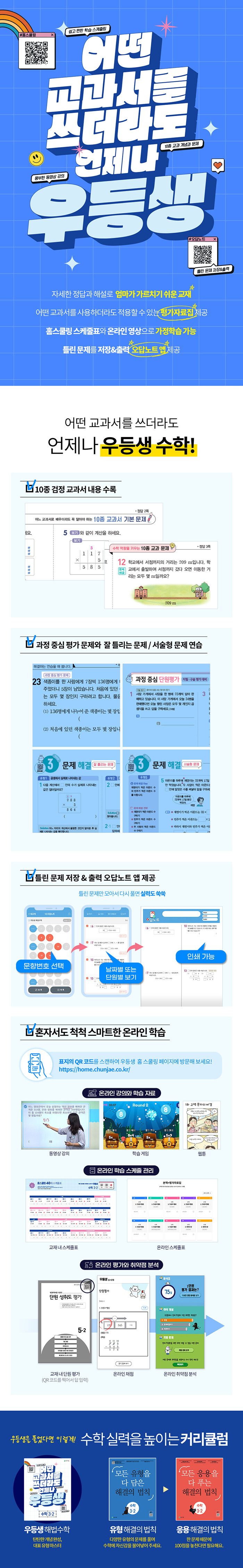 언제 어디서나, 어떤 교과서로 공부하더라도 우등생 한 권이면 학교 공부가 완성된다. 요즘 시대에 딱 맞는 다양한 학습자료들과 풍부한 동영상 강의로 쉽게 풀 수 있는 방법까지 알려 주니까 수학이 어렵지 않다. 엄마가 편하게 가르칠 수 있어 좋다.