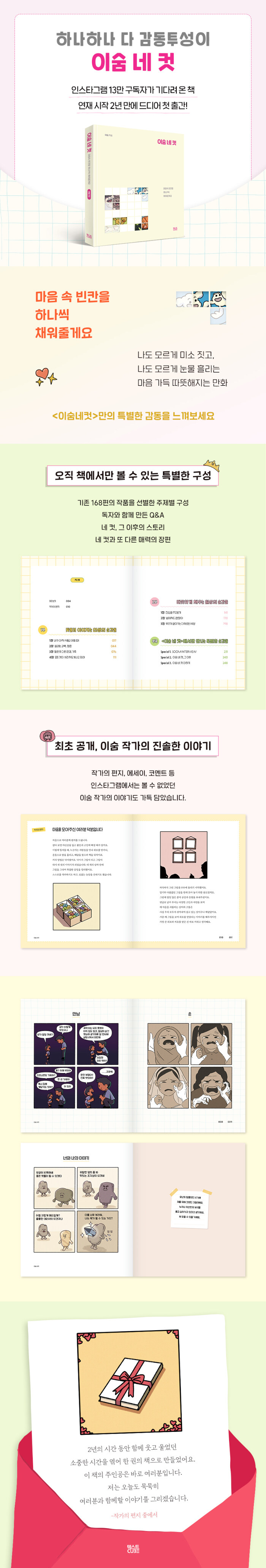 <이숨 네 컷>은 가족, 인간관계, 사랑, 반려동물, 나, 일상 등 다채로운 주제를 넘나들며 무심코 지나치는 인생의 가치를 돌아보게 이끌어준다. 이 책을 덮고 나면 소중한 사람이 떠오르며 그들에게 사랑을 전하고 싶어지고, 지쳐있는 나는 어느새 따뜻한 위로를 얻게 된다.
