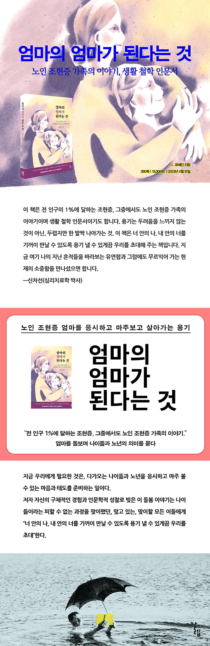 엄마의 나이듦을 오롯이 마주하고 껴안기 위한 몸부림의 기록.저자는 조현증을 앓는 엄마를 돌보았던 혼란스럽고 두려웠던 시간을 다시 “천천히, 자세히, 때로는 아프게 파고들면서 (…) 읽어 내려”간다. 그리하여 저자는 철학적, 사회학적, 심리학적, 의학적 개념들을 넘나드는 치열한 사유 끝에 나이듦과 노년, 돌봄과 죽음에 대한 성찰을 길어 올린다. 이 책은 그렇게 쓰인, 노인 조현증을 다룬 국내 최초의 “생활 철학 인문서”이다. 우리 모두는 부모의 나이듦과 마주한다. 그리고 약해진 부모를 보살피며 ‘엄마의 엄마’가 되어 간다. 그러나 그 과정은 순탄치 않다. 불현듯 다가온 부모의 나이듦에 당혹스러워하고, 갈팡질팡한다. 저자는, 자신도 같은 어려움을 겪었다고 고백한다. 그리고 어머니를 돌본 경험 속에서 자기 자신을 읽어 내기 위해 책을 손에서 놓지 않았고, 놓을 수 없었다고 말한다. 그리하여 한 아이의 엄마가 되어 생태적지혜연구소에서의 노마드적 탐색을 돌봄과 유대의 실천으로 이어가고 있는 저자는, 자신이 ‘엄마의 엄마’가 된 과정을 한 권의 책으로 빚어냈다. 저자의 이야기와 성찰은 지금 우리에게 필요한, 부모의 나이듦을 응시하고 마주 볼 수 있는 용기와 지혜를 준다.
