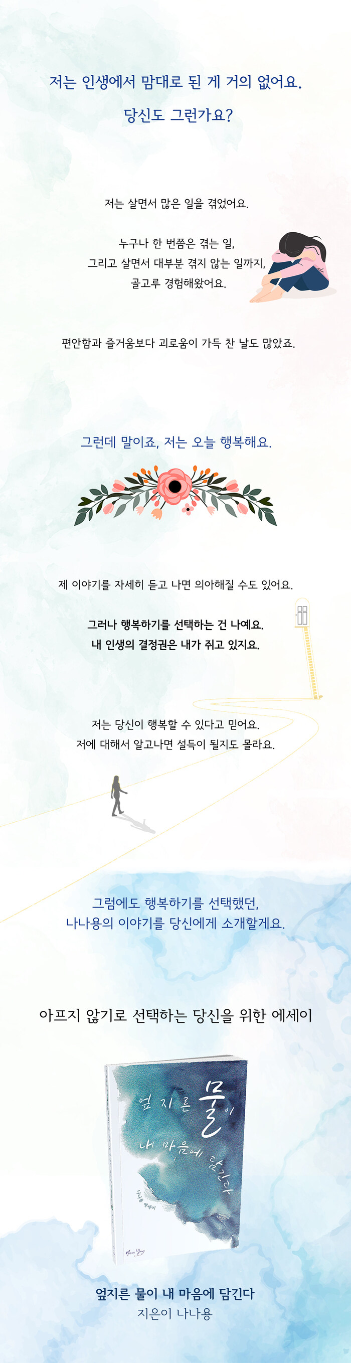 이 책에서는 저자가 겪었던 삶의 크고 작은 아픔과 감동을 풀어냄으로써, 상처를 어떻게 받아들일지는 온전히 본인의 선택이며 괴로워하는 것 또한 스스로가 택한 길이자 책임이라는 메시지를 전한다. 그리고 단순한 위로나 가르침을 주지는 않는다. 대신, 스스로 자신에게 맞는 인생의 해답을 찾도록 방향을 제시하며 아픔을 근본적으로 치유할 수 있도록 돕는다.
