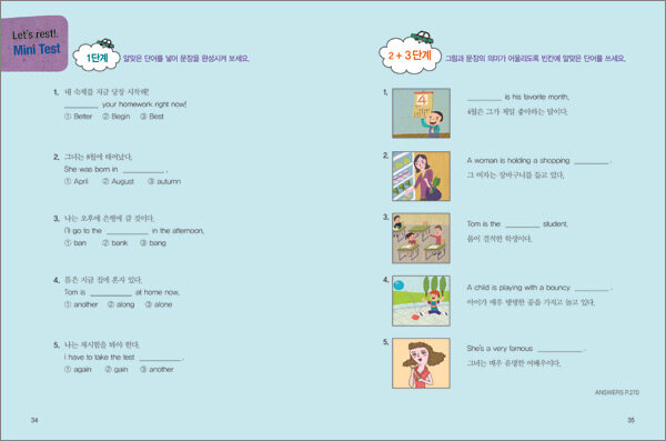예를 들어 ask(묻다)를 익힌 후에 일반 예문이 나오는 것이 아니라, 조금씩 문장으로 완성되는 단계인 ask a question(질문을 하다) → My teacher asked a question.(선생님께서 질문을 하셨다.) → My teacher asked a question to me. (선생님께서 나에게 질문을 하셨다.)와 같이 각각 3단계의 영어 예문이 나온다.