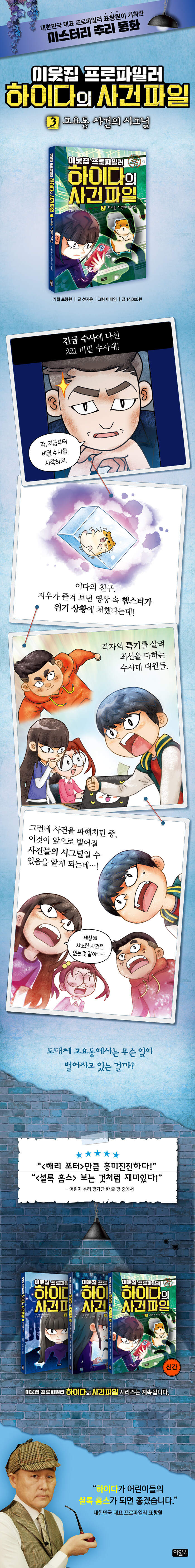 대한민국 대표 프로파일러가 전하는 미스터리 추리 동화SBS <그것이 알고 싶다> 등 시사 고발 프로그램에 출연하여 ‘범죄분석전문가’, ‘범죄심리학자’로 널리 이름을 알린 대한민국 대표 프로파일러, 표창원 소장이 이번에는 어린이 친구들에게 프로파일링 중심의 새로운 이야기를 들려줍니다. <이웃집 프로파일러 하이다의 사건 파일>은 우리의 평범한 일상 속에서 만날 수 있는 실제 범죄 사건을 모티브로, 재미있게 구성된 추리 동화예요. 우리가 지금 살고 있는 곳과 비슷한, 어디에나 있을 것 같은 평범한 동네 고요동을 중심으로 사건이 일어나지요. 그래서 더욱 생생하고 현실감 넘치는 미스터리가 펼쳐진답니다. 동화가 끝난 후에는 표창원 소장이 쓴 ‘표 소장의 추리 매뉴얼’을 통해 추리 용어와 상식, 배경지식을 얻을 수 있어요. 추리 퀴즈를 통해 실전 추리 연습도 할 수 있고요. 책을 다 읽고 나면 추리가 어렵지 않게 느껴지는 것은 물론, 읽다 보면 풍부한 상상력과 매서운 논리력, 추리력도 자연스럽게 얻을 거예요.