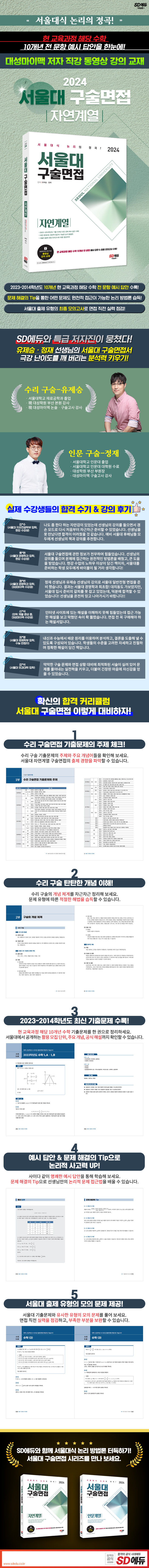 이 책은 그동안 서울대를 지원한 학생들과 함께했던 구술면접 현장 강의의 집약체입니다. 선생님들이 푼 것, 학생들이 푼 것, 학생들에게 피드백한 것, 학생들로부터 받은 피드백까지도 ‘예시 답안’에 모두 담았습니다. 서울대 문제는 어렵습니다. 제시문 기반의 심층 인문·수리 구술시험을 시행하는 대학들 중에서도 압도적으로 어렵습니다. 넓고 깊은 사고력을 요합니다. 하지만 난공불락은 아닙니다. 처음부터 잘하는 학생은 거의 없습니다. 서울대를 지원한 자질을 갖춘 학생이라면, 차분하게 꼼꼼히 준비한다는 전제하에 누구나 잘 할 수 있습니다. 처음에 잘하지 못한다고 낙담할 필요 없습니다. 자기 자신을 믿고, 선생님들을 믿고, 이 책을 믿고 꾸준히 공부하기를 당부합니다. 특히 서울대 자연계열 구술면접 수업을 접하기 힘든 여건에 있는 학생들에게 이 책이 큰 도움이 되기를 기대합니다.