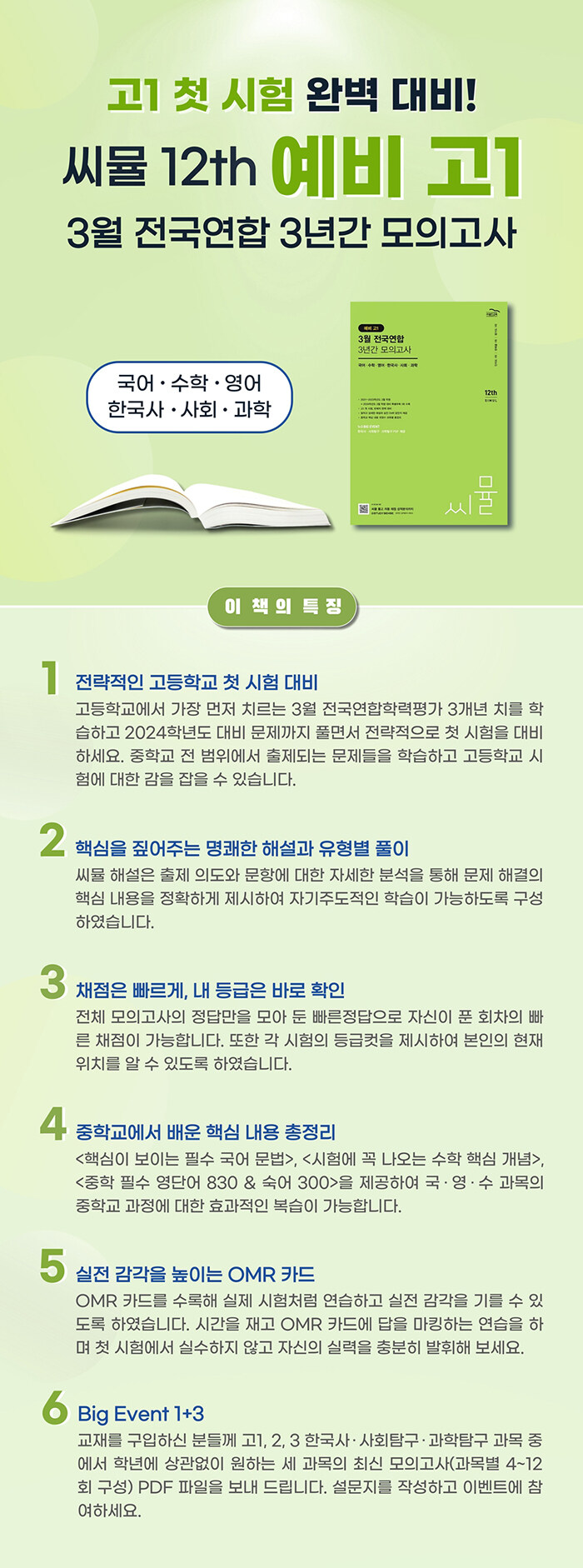고등학교에서 가장 먼저 치르는 3월 전국연합학력평가 3개년 치를 학습하고 2024학년도 대비 문제까지 풀면서 전략적으로 첫 시험을 대비하세요. 중학교 전 범위에서 출제되는 문제들을 학습하여 고등학교 시험에 대한 감을 잡을 수 있습니다.