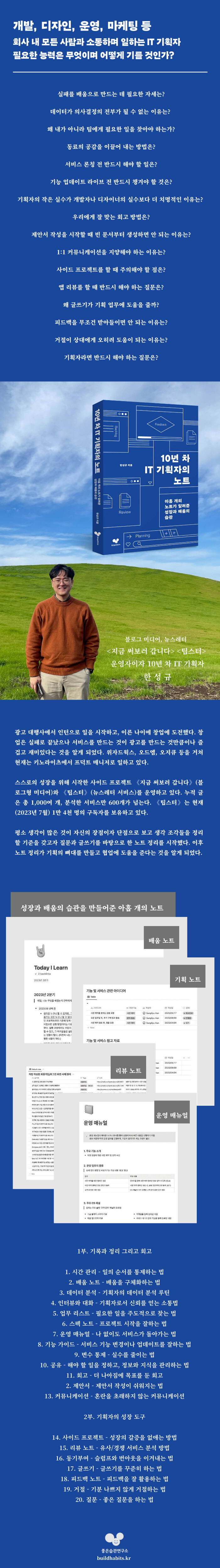 작가는 이를 위해 총 9개의 노트를 갖고서 IT 기획자의 업무를 10년 넘게 수행해오고 있습니다. 9개의 노트를 하나씩 나열하면 《배움 노트》 《리뷰 노트》 《기획 노트》 《스펙 노트》 《운영 매뉴얼》 《기능 가이드》 《백로그》 《회고 노트》 《피드백 노트》입니다.