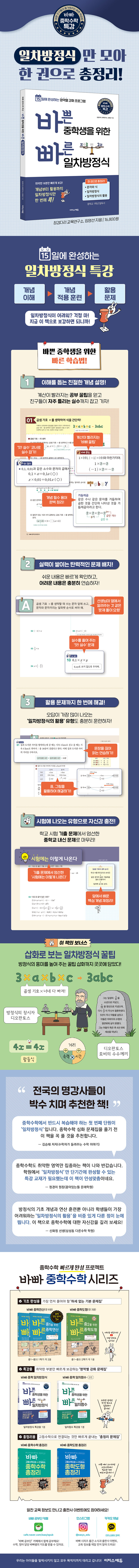 이 책, ‘바빠 중학 일차방정식’은 방정식이 약한 중학생을 위한 맞춤용 교재입니다. 방정식의 기초부터 차근차근 이해할 수 있도록 개념을 설명하여 혼자서도 충분히 학습할 수 있습니다. 개념을 이해하고 유형별로 충분한 개념 적용 훈련을 한 다음 활용 문제까지 해결하니, 이 책을 마치고 나면 일차방정식에 자신감이 생길 것입니다.
