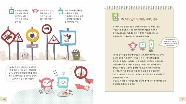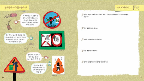 이 책은 감상부터 발상까지 차근차근 진행될 수 있도록 구성되어 있습니다. 이 책을 읽는 아이들은 해당 사물을 접할 수 있는 명화를 먼저 감상하고, 그 사물에 대해서 두 캐릭터가 나누는 이야기를 읽은 다음, 자기 나이 또래의 디자인 작품까지 살펴본 뒤에 자신의 생각을 글로 써 보게 됩니다. 또한 그 생각을 간단하게 구현해 볼 수 있는 별책 부록(워크북)을 활용해서 전체적인 디자인 과정을 체험해 볼 수 있지요. 수영복, 구두, 자동차, 조명, 표지판 등 우리 생활과 가까운 여러 디자인 영역을 두루 아우르고 있어서 아이가 흥미를 보이는 부분을 먼저 읽어도 무방합니다. 편안하게 읽어 나가는 가운데 자연스럽게 발상 훈련이 되는 것은 물론, 디자인이 우리 생활에서 얼마나 중요한 것인지도 깨달을 수 있습니다.