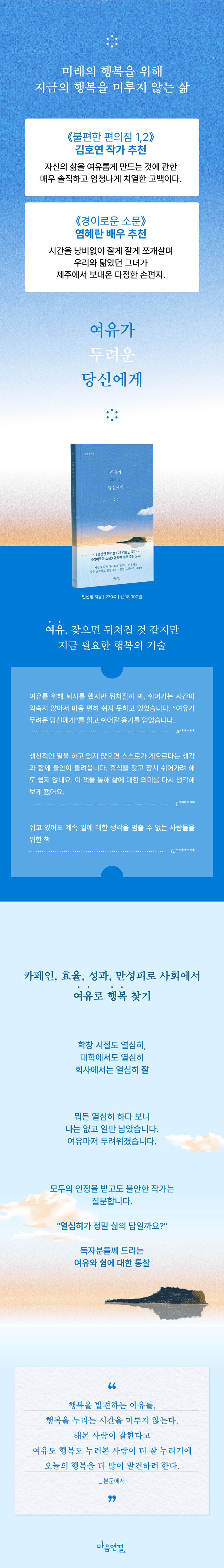 작가는 열심의 정석이었다. 명문대를 나왔고, 대기업에 취직했다. 착실히 노력한 끝에, 신입사원 교육 및 CEO의 글을 작성하는 위치까지 올라갔다. 타사에서 강의 요청까지 하는 능력 있는 직원에게 드리워진 일과 피곤의 그림자. “나는 행복한가?” 작가는 문제를 직시한다. 지금 행복하기 위해 여유가 필요하다.
