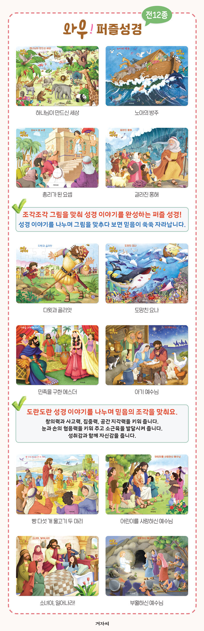 조각조각 그림을 맞춰 성경 이야기를 완성하는 퍼즐 성경. 퍼즐 뒷면에 있는 성경 이야기를 먼저 읽어 주자. 믿음의 조각을 하나하나 맞추다 보면 아이의 믿음도 쑥쑥 자라날 것이다.
