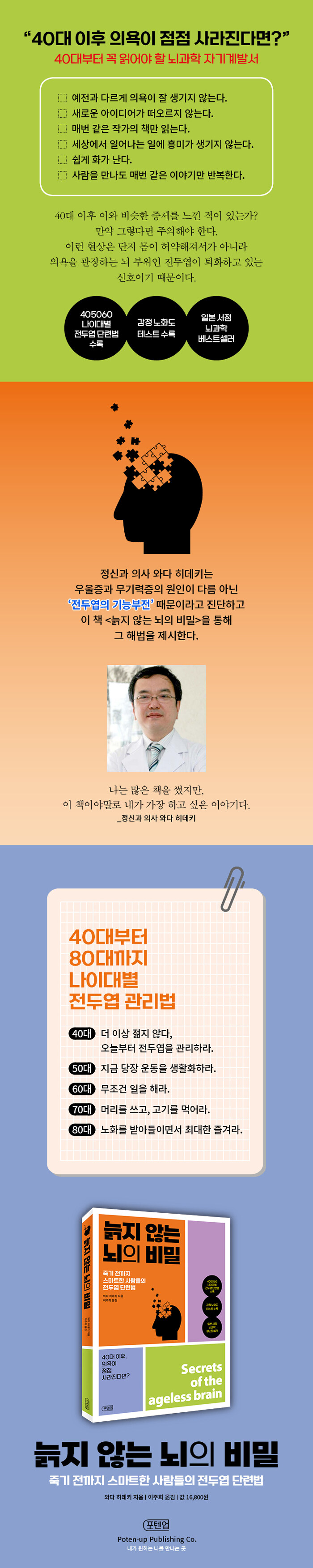 40대부터 꼭 읽어야 할 뇌과학 자기계발서‘예전과 다르게 의욕이 잘 생기지 않는다, 새로운 아이디어가 떠오르지 않는다, 매번 같은 작가의 책만 읽는다, 세상에서 일어나는 일에 흥미가 생기지 않는다, 쉽게 화가 난다, 사람을 만나도 매번 같은 이야기만 반복한다…….’