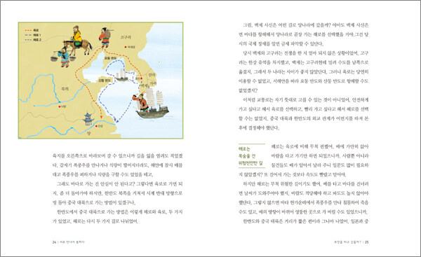 2천 년이 넘는 긴 시간 동안 세 나라 사이에 전쟁과 다툼만 있었던 건 아닙니다. 새로운 지식과 기술을 배우기 위해, 권력을 보이거나 인정받기 위해, 물건을 사고팔아 돈을 벌기 위해. 세 나라의 사람들은 다양한 이유로 서로를 만나고 싶어 했고, 지금은 비행기로 한두 시간이면 도착할 거리를 몇 달에 걸쳐 목숨을 걸고 오갔습니다.