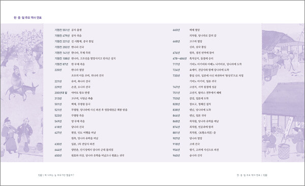 정보를 바탕으로 상상을 접붙인 재미있는 그림은 내용의 이해를 도우며 글에 생기를 더해줍니다. 글과 함께 적절히 배치된 도판 또한 단순한 보여주기에서 반걸음 더 나아가 글을 유기적으로 보충해 줍니다. 책 뒤에는 세 나라의 주요 역사를 한눈에 볼 수 있는 연표를 수록하여 책에서 주제별로 다루었던 이야기가 어디쯤 위치하는지 가늠하며 역사의 흐름을 입체적으로 바라볼 수 있도록 도와줍니다.