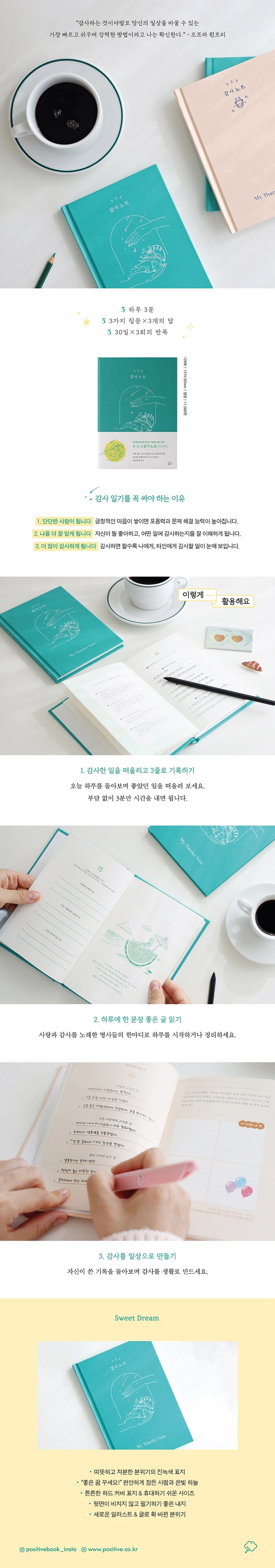 3만 부 이상 판매되며 많은 사랑을 받아온 《3·3·3 감사 노트》가 새로운 일러스트와 명언을 포함해 다시 돌아왔다. 《3·3·3 감사 노트》 스윗 드림 에디션은 편안하게 잠든 모습으로 모두의 행복한 밤을 응원하는 디자인이다.
