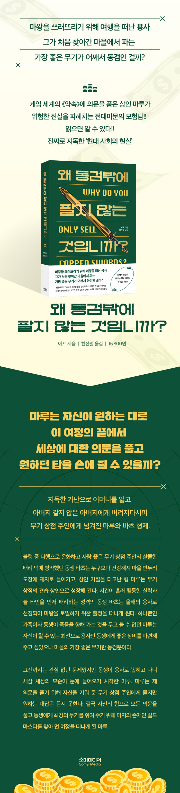 판타지 소설로 배우는 현실 세계의 어두운 구조!!이 소설은 게임 <드래곤퀘스트>의 세계관을 빌려 현실 세계의 어두운 구조를 고찰한 판타지 소설이지만 한편으로는 현대 사회의 풍자와 은유로 배우는 재미있는 경제 소설이다.