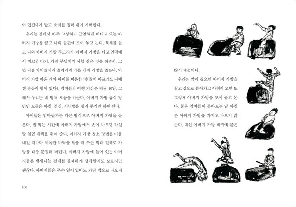 ‘아버지가 가방에 들어 있는 동네’에서 ‘근엄하고 고상하게 버티고 있는’ 아버지 가방을 신 나게 뛰어넘으며 노는 아이들의 모습은, 권위에 갇혀 아이들과 소통하지 못하는 모든 것들로부터 자유로워지고 싶은 마음을 대변한다.