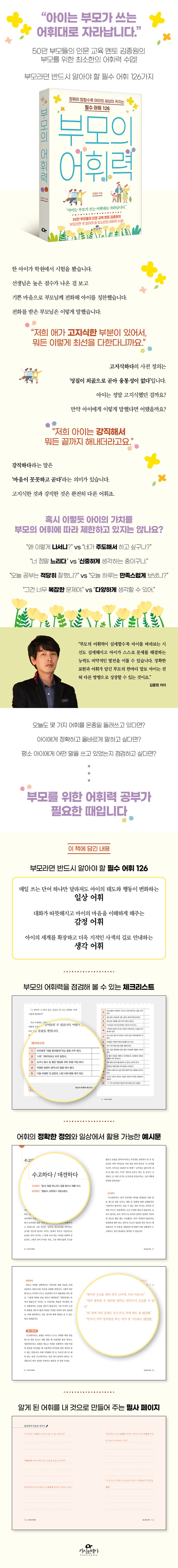 대한민국 50만 학부모가 선택한 인문 교육 전문가 김종원 작가가 고르고 고른, 부모라면 꼭 알아야 할 필수 어휘 126가지를 한 권으로 정리한 어휘 공부 책이다. 그는 지금껏 인문학적 소양을 바탕으로 한 부모의 말과 대화법의 중요성을 널리 알려왔는데, 이번 책에서는 그전에 부모에게 반드시 어휘 공부가 필요하다고 말한다. 왜일까? 부모의 어휘는 아이가 세상을 인식하는 첫 번째 틀이다. 그런데 ‘헉’, ‘대박’ 등 몇 개의 어휘들이 일상을 독식하고 있거나, ‘혼내다’와 ‘알려 주다’와 같이 혼동해서 잘못 쓰기 쉬운 어휘들로 아이와 소통하다 보면, 결국 부모는 아이를 올바르게 훈육할 수 없고 아이는 부모의 말을 정확히 듣고 이해할 수 없기 때문이다.
