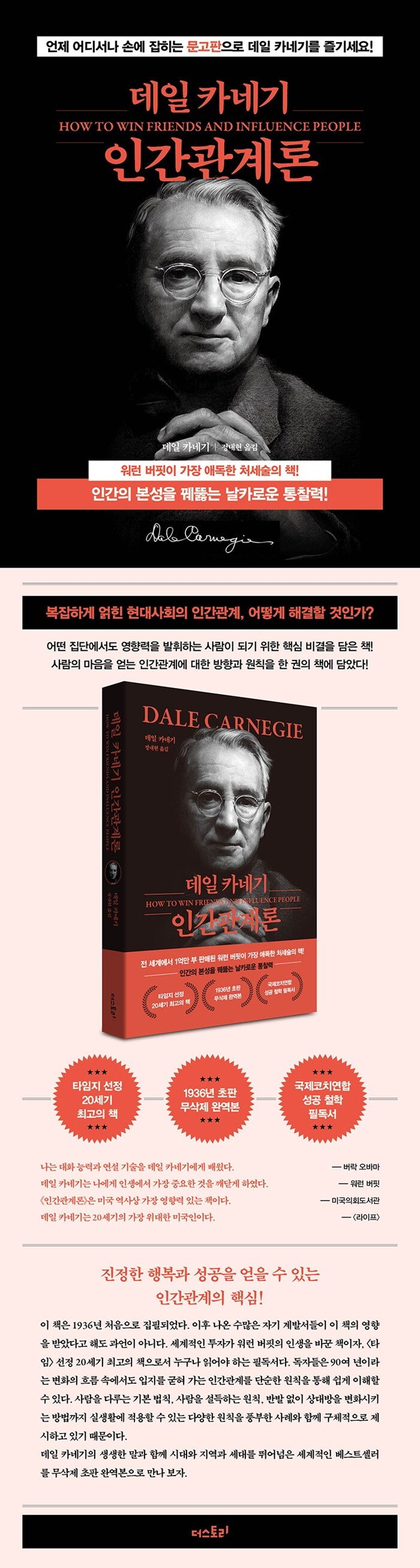 더스토리에서 출간된 『데일 카네기 인간관계론』은 약 90여 년 전에 집필되었다. 때문에 독자들은 분명 책을 읽다가 ‘90여 년’이라는 시간을 문자 그 이상으로 충분히 경험할 수 있을 것이다. 또한 독자들은 결국 빠른 변화의 흐름 속에서도 입지를 더욱 굳혀가는 인간관계에 대한 변치 않는 관심 아래서 ‘90여 년’의 세월을 잊고 훌쩍 뛰어넘는 짜릿함을 느낄 것이다. 뿐만 아니라 건강한 인간관계 형성에 한 걸음 더 다가가 있는 자신을 발견하는 쾌감까지 얻을 수 있을 것이다. 데일 카네기가 독자에게 ‘인간관계’라는 쉽지 않은 과제를 가정과 규모가 더 큰 사회(정계의 이야기 등을 다루는 등)를 아우르는 인간관계에 대한 이야기를 실제 사례들을 제시하며 제공해주고 있는 덕분이다. 물론 이러한 점은 독자로 하여금 지치지 않는 관심을 끌어내기에도 충분하다. 왜냐하면 데일 카네기는 독자가 처할 법한 많은 상황들을 실제 자신의 강의 수강자들의 체험을 통해 제시하고 있기 때문이다. 데일 카네기는 독자가 이 책을 읽고 난 뒤 지혜를 담아두는 수준에 머무르도록 만드는 독서용으로 그치지 않도록 독자를 독려한다. 즉, 이 책의 독자가 인간관계에 대한 조언을 머릿속 지식으로 쌓아두는데 머무르는 단계를 넘어서서 독자가 읽은 내용을 실제 상황에 실행해봄으로써 실제 자신의 인간관계를 좀 더 나은 수준으로 개선하고 긍정적으로 변화시키게 한다. 그래서 이 책은 단순한 이론서에 그치지 않고 그 이상의 가치를 부여받아 결국 ‘90여 년’이라는 시간을 자연스럽게 뛰어넘어 독자들의 곁에 남아있는 것이다.