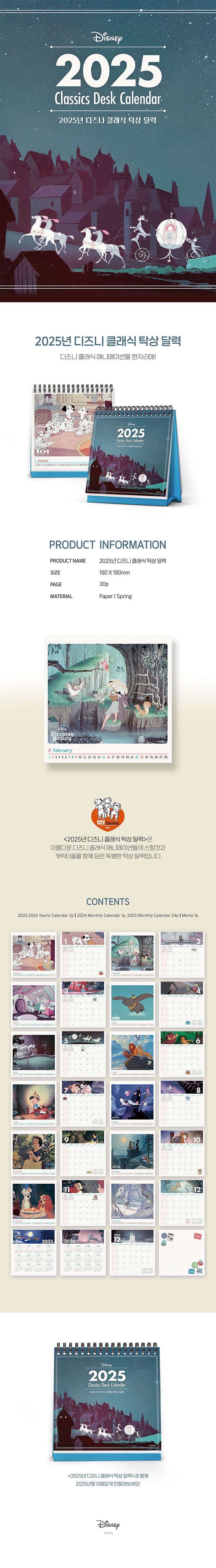 <2025년 디즈니 클래식 탁상 달력>은 디즈니 대표 캐릭터인 ‘미키 마우스’부터 덤보, 밤비, 피터팬, 앨리스 등 아름다운 디즈니 클래식 애니메이션들의 스틸컷과 캐릭터들을 함께 담은 특별한 탁상 달력입니다.